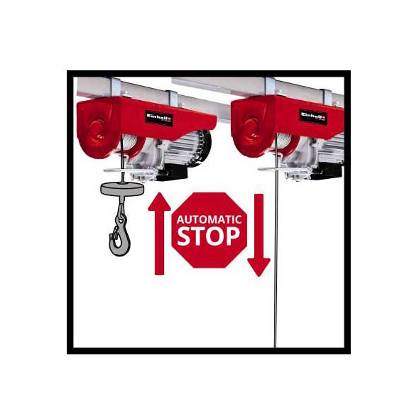 Električna dizalica TC-EH 600 je velika pomoć za podizanje i transport teških tereta u radionici ili garaži za hobi ili prilikom izvođenja radova na izgradnji kuće. Za Einhell prioritet je sigurnost i funkcionalnost: dizalica sa ima ekstra dugačak žičani kabl od 18 metara (prečnik 4,5 milimetara), tako da je maksimalna visina podizanja bez vođice 18 metara i opterećenja do 300 kilograma se mogu pomerati – brzinom od osam metara u minuti. Uz pomoć valjka za navođenje kapacitet opterećenja se povećava na 600 kilograma, visina podizanja je devet metara, a brzina podizanja je četiri metra u minuti. Valjak sa kukom za opterećenje tako udvostručuje maksimalnu težinu opterećenja. Za dodatnu sigurnost prilikom rada, postoji prekidač za rukovanje sa funkcijom za zaustavljanje u slučaju nužde i sigurnosni zatvarač na kuki za teret. Osim toga, automatska kočnica osigurava opterećenje u svakom položaju. Dizalica sa sajlama je takođe opremljena automatskim graničnikom, koji sprečava pregrevanje motora u isto vreme. Motor sa termostatskim prekidačem doprinosi dugom veku trajanja i, sa svojom snagom od 1.050 W, pruža snažnu i dinamičnu uslugu. Za jednostavnu montažu oprema dolazi u kompletu sa dve duple stezaljke, tako da korisnik nema problema.
