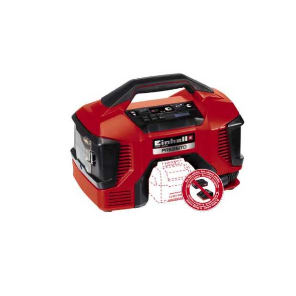 Hybrid kompresor PRESSITO je multifunkcionalni kompresor sa pumpama visokog i niskog pritiska i opcijom usisavanja pod niskim pritiskom. Praktični hibridni kompresor može se upravljati korišćenjem napojnog kabla ili visokokvalitetne 18-voltne sistemske baterije iz serije Power X-Change (6 u 1-funkcija). Hybrid kompresor PRESSITO sa pumpom visokog pritiska za pumpanje vazduha u automobilske i biciklističke gume nije samo savršeni dodatak za garažu, već je idealan i za korišćenje na putu. Za sport takođe, praktičan je za naduvavanje lopti tačno gde je akcija ili za završnu proveru guma pre velike trke. Pumpa visokog pritiska ima maksimalni radni pritisak od 11 bara i korisnik može ručno da ga podesi. Funkcija automatskog isključivanja osigurava da se kompresor zaustavlja kada se postigne željeni pritisak. Pumpa niskog pritiska omogućuje da se dušeci ili gumeni čamci naduvaju za kratko vreme, a funkcija usisavanja sa niskim pritiskom pomaže brzom pražnjenju istih. Prebacivanje između funkcije visokog i niskog pritiska se bira tasterom. 3-delni set sa adapterima za gume za automobil i biciklističke gume, za fudbal i košarku, za dušeke i gumene čamce. Kablovi i creva za hibridni kompresor se drže direktno na samom alatu, tako da se ne mogu izgubiti na putu. Na kuđištu postoji mesto predviđeno za set priključaka. Hibridni kompresor ima digitalni displej sa indikatorom pritiska, a ručne kontrole su lake za upotrebu. Kompaktni i lagani hibridni kompresori se lako mogu odložiti i, zahvaljujući punjivoj bateriji i praktičnoj ručki za nošenje, može se nositi u automobilu. Prednosti bežičnog alata su očigledne: Sa novom generacijom moćnih i dugotrajnih baterija kompanije Einhell, multifunkcionalni kompresor nudi i pogodnost za mobilnu upotrebu. Baterije sa visokokvalitetnim litijum-jonskim ćelijama mogu se takođe koristiti za sve članove porodice Power X-Change, kako za baštu tako i u području alata. Punjiva baterija i punjači za Power X-Change proizvode su dostupni odvojeno u maloprodajnim objektima.