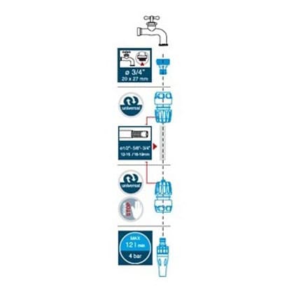 Mlaznica je opremljena sistemom za prilagođavanje mlaza od kupastog spreja do direktnog mlaza. Veoma pogodna za precizno zalivanje,maksimalnog protoka vode do 12 l/min. Dolazi u setu sa brzom AQUA-STOP spojnicom za crevo 3/4mm,brzom spojnicom 3/ 4” sa stalnim protokom vode i konektorom. Namenjena za slavinu 3/4”.