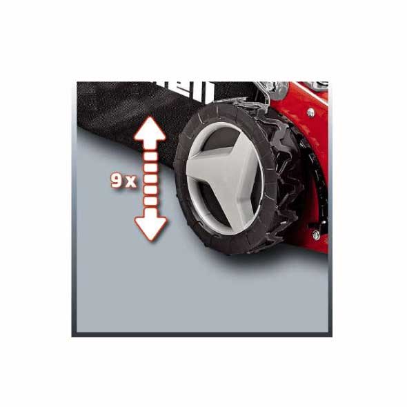 Za lako, ali precizno prilagođavanje individualnim zahtevima, GC-PM 46/1 S B&S Einhell ima centralni uređaj za podešavanje visine rezanja na 9 nivoa. Kabl startera je lako dosegnuti pomoću dugačke ručice za lakše pokretanje.