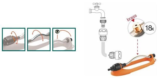 Oscilirajuća prskalica sa kontinualnom regulacijom luka za raspršivanje od 20*-100*.ova prskalica je izuzetno tiha i ima različite mogućnosti navodnjavanja, za ravnomerno pokrivanje malih i velikih površina sa pravougaonim delovima. Metalna oscilirajuća ruka sa 18 mesinganih mlaznica, masivno anti-nagibno opterećeno postolje pruža vrlo stabilno korišćenje. Protok vode 18L/min.
