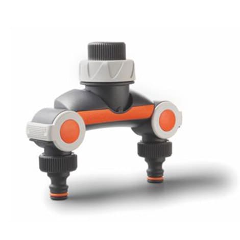 Spojnica sa duplim izvodima za slavine 3/4“ sa klik prihvatom. Omogućava regulisanje protoka vode iz slavine istovremeno na oba izlaza ili se može preusmeriti mlaz sa jednog izlaza na drugi do potpunog zatvaranja .Korisno za istovremeno korišćenje različitog pribora.
